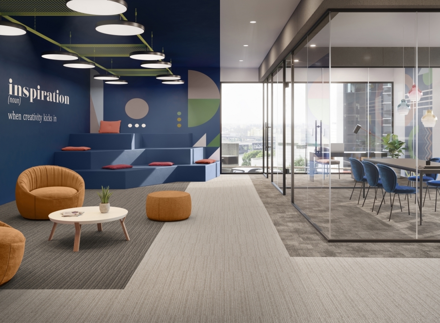 12 двухцветных декоров Expansion point со сменяющими друг друга плоскостями однородных цветов, близких по тональности и не центрированных, что характерно для живописи цветового поля. Линии этой ковровой плитки будто начерчены от руки. Применяйте ее как саму по себе, так и дополняя и привнося разнообразие.